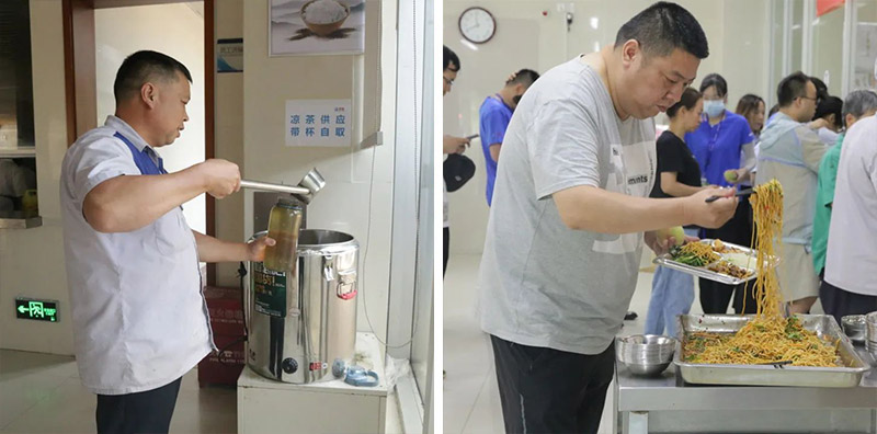 食堂還為所有職工貼心準(zhǔn)備了消暑解渴的免費涼茶,配方有金銀花、菊花、蒲公英、甘草等,既能防暑,又有清熱化濕、提神醒腦等功效。清爽開胃的涼面,拌一拌,食欲滿滿。