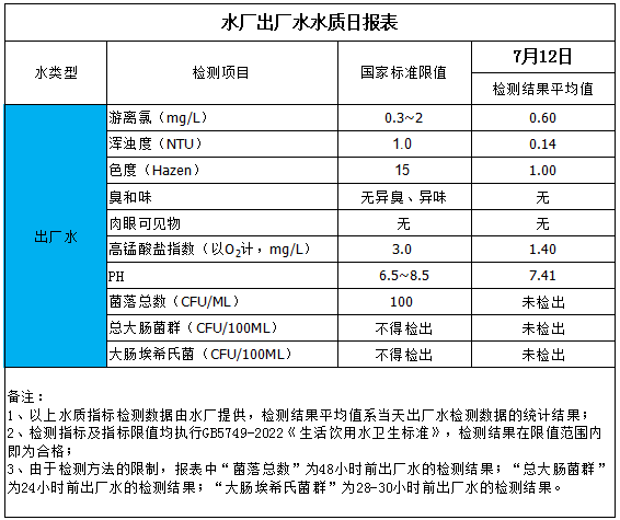 水廠出廠水水質(zhì)日?qǐng)?bào)表(2025-7-12)