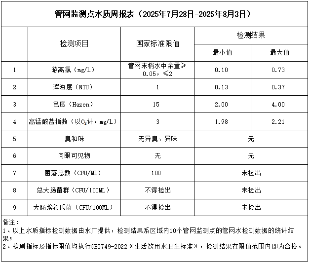 管網(wǎng)監(jiān)測點水質(zhì)周報表(2025年7月28日-2025年8月3日)