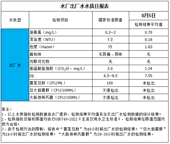 水廠(chǎng)出廠(chǎng)水水質(zhì)日?qǐng)?bào)表(2025-8-5)