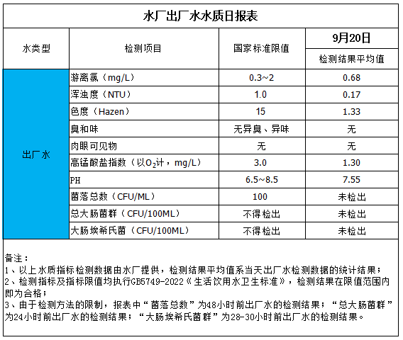水廠出廠水水質(zhì)日報表(2025-9-20)