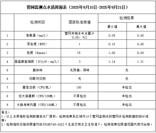 管網(wǎng)監(jiān)測點水質(zhì)周報表(2025年9月15日-2025年9月21日)