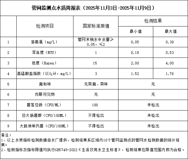 管網(wǎng)監(jiān)測(cè)點(diǎn)水質(zhì)周報(bào)表(2025年11月3日-2025年11月9日)