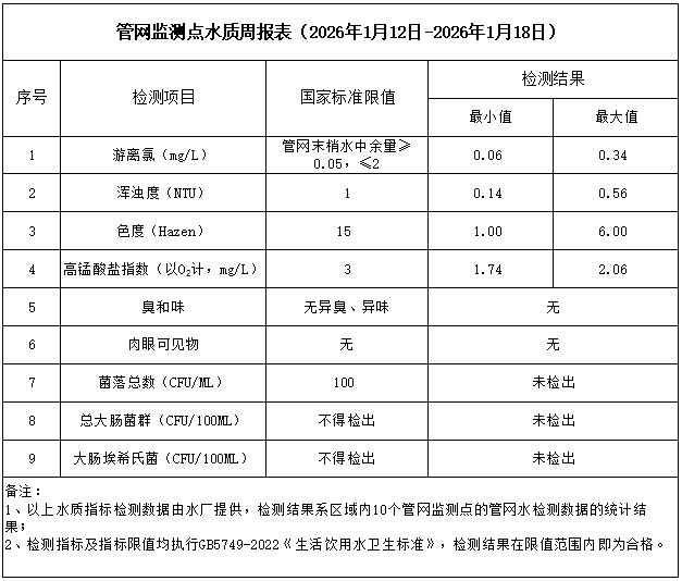 管網(wǎng)監(jiān)測點(diǎn)水質(zhì)周報(bào)表(2026年1月12日-2026年1月18日)