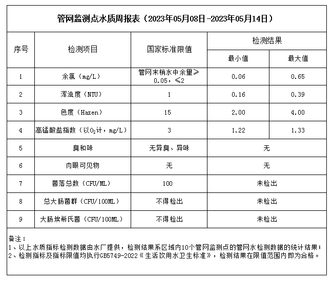 管網(wǎng)監(jiān)測點(diǎn)水質(zhì)周報(bào)表(2023年05月08日-2023年05月14日)