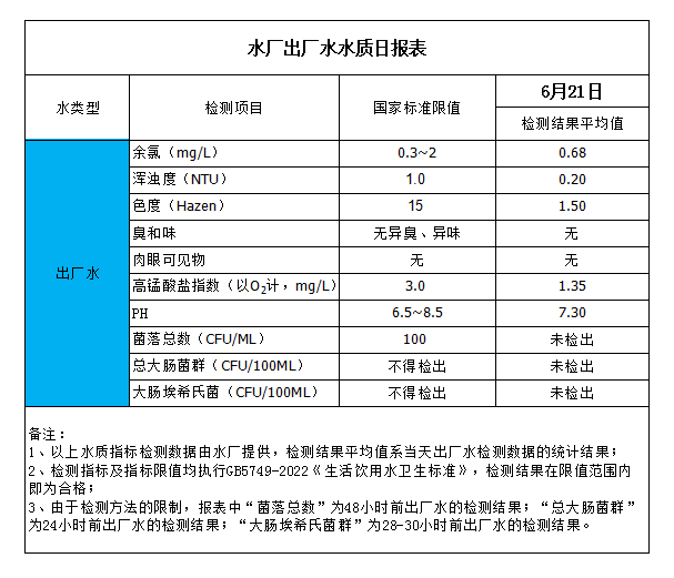 水廠(chǎng)出廠(chǎng)水水質(zhì)日?qǐng)?bào)表(2023-6-21)