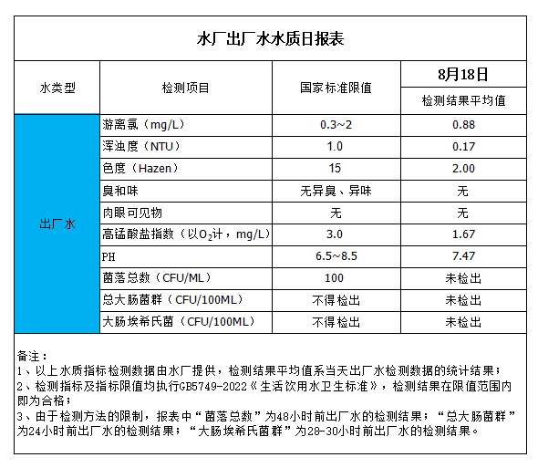 水廠出廠水水質(zhì)日報表(2023-8-18)