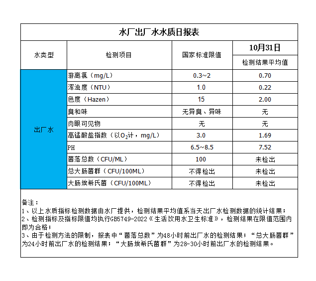 水廠出廠水水質(zhì)日報表(2023-10-31)