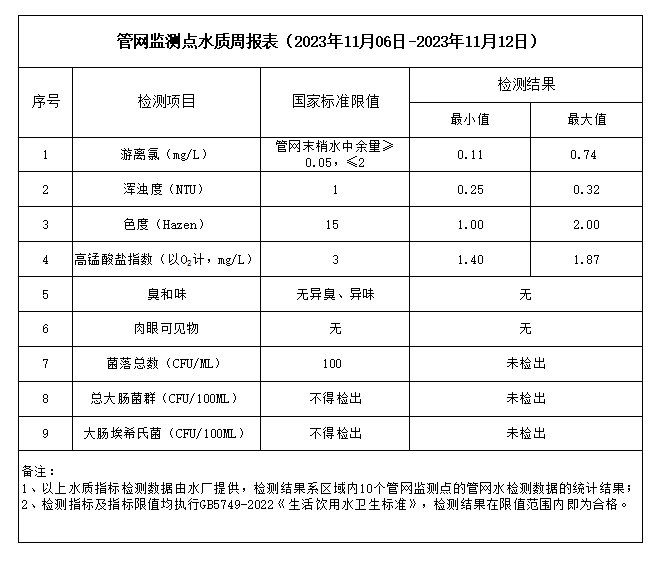 管網(wǎng)監(jiān)測點水質(zhì)周報表(2023年11月06日-2023年11月12日)