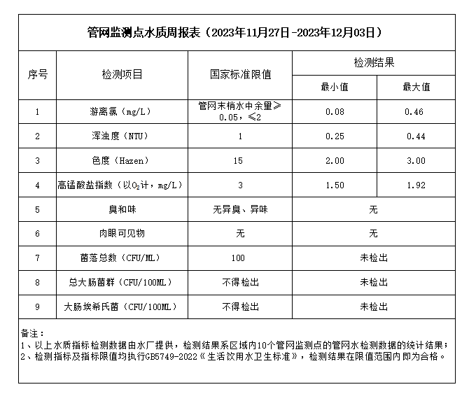 管網監(jiān)測點水質周報表(2023年11月27日-2023年12月03日)