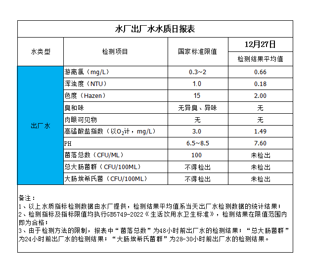 水廠出廠水水質(zhì)日?qǐng)?bào)表(2023-12-27)