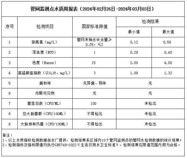 管網(wǎng)監(jiān)測(cè)點(diǎn)水質(zhì)周報(bào)表(2024年02月26日-2024年03月03日)