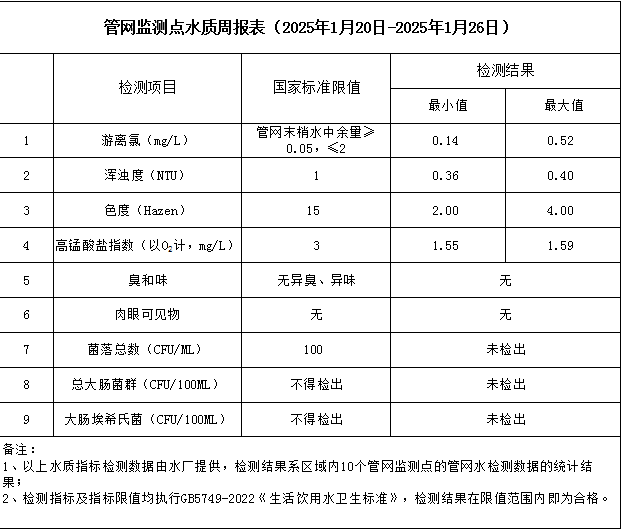 管網(wǎng)監(jiān)測點水質(zhì)周報表(2025年1月20日-2025年1月26日)