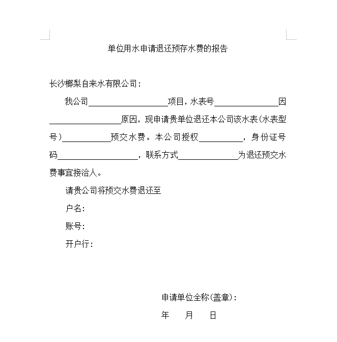 點擊下載單位用水申請退還預(yù)存水費的報告